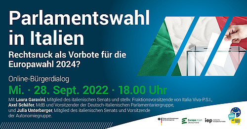 Am 25. September findet in Italien die Parlamentswahl statt, die nicht nur als Schicksalswahl für Italien, sondern die gesamte EU gilt. Treten Sie in den virtuellen Dialog mit Laura Garavini, Mitglied des italienischen Senats und stellv. Fraktionsvorsitzende von Italia Viva-P.S.I., Axel Schäfer, MdB und Vorsitzender der Deutsch-Italienischen Parlamentariergruppe, sowie Julia Unterberger, Mitglied des italienischen Senats und Vorsitzende der Autonomiegruppe.