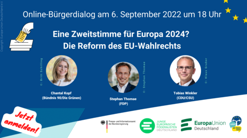 Bekommen alle EU-Bürgerinnen und -Bürger eine zweite Stimme bei der Europawahl 2024? Schalten Sie sich ein am 6. September und diskutieren Sie mit Chantal Kopf (Bündnis 90/Die Grünen), Stephan Thomae (FDP) und Tobias Winkler (CDU/CSU) bei unserem ersten Online-Bürgerdialog nach der Sommerpause.