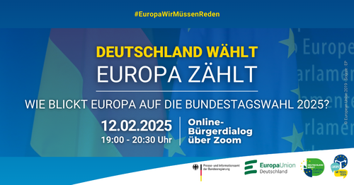 "Deutschland wählt, Europa zählt! Wie blickt Europa auf die Bundestagswahl 2025?" am Mittwoch, 12. Februar 2025 von 19 Uhr bis 20:30 Uhr über Zoom.